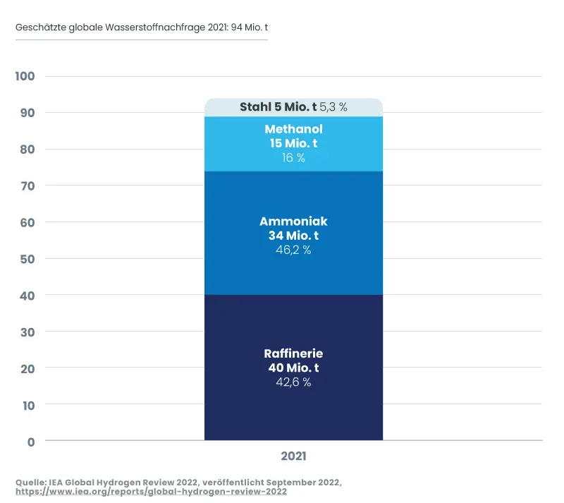 Kurzfristig sehen die Aussichten für Wasserstoff auf der Nachfrageseite mit 94 Millionen Tonnen im Jahr 2021[1] gut aus.