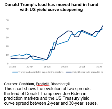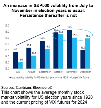 Following the first presidential debate, uncertainty on the election winner has declined sharply. However, markets have likely to wait several months to get more clarity on policy implementation: if an elected Donald Trump does (almost) all that he promised, inflation would rise due to higher tariffs and a tighter labour market. To remain credible, the Federal Reserve would likely have no choice but to tighten monetary policy despite faltering activity. The risks of such a tail scenario is reflected by unusually persistence of high volatility in November and December VIX contracts, while market volatility historically declines sharply post-election.