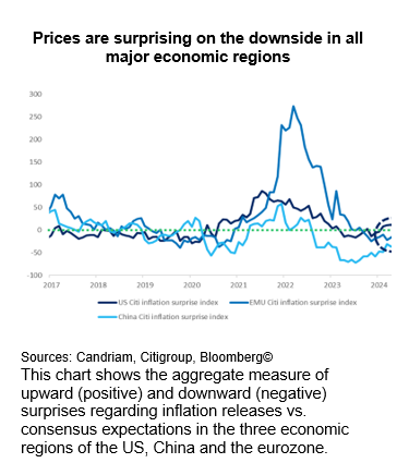 Beyond political uncertainties, we focus on policy actions as important market drivers. In assessing the growth/inflation mix, we note that global disinflation trends have been confirmed by the most recent data, notably in the US. At the current juncture, our scenario that interest rates have peaked and the Federal Reserve would start its monetary policy easing cycle in September is gaining traction.