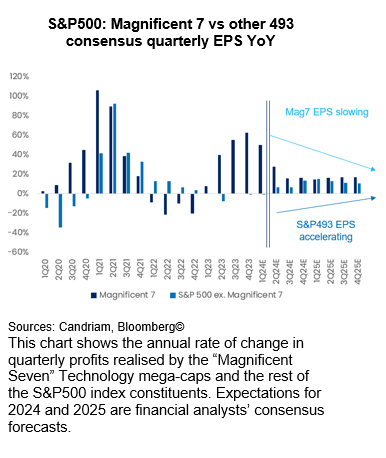 - Regarding the US, beyond robust earnings, the favourable repricing of monetary expectations represents a support for Tech stocks. Broad market leadership within IT and the industry’s relative insensitivity to the upcoming US presidential elections also justify our view. As we enter the Q2 earnings season, strong EPS growth should continue to be supportive, while a narrowing growth differential should be a catalyst for the market to broaden out beyond mega-caps.