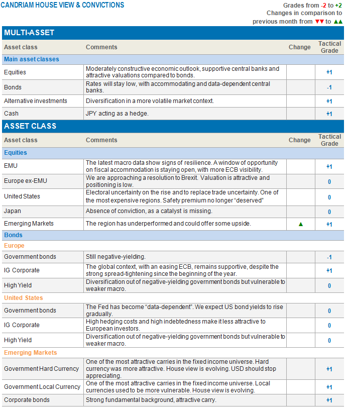 Our positioning is overweight euro zone equities and we have let the overweight drift higher without much concern. The region finally benefit from the lower perceived political risk as a hard Brexit is barely an option now. Some good news has already been priced in. Much more upside will be conditioned by tangible signs of improving growth level in the GDP and earnings growth for instance but for now, it is enough to justify our stance.