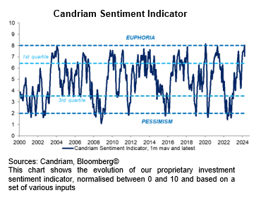 Our composite sentiment indicator, based on a comprehensive set of market factors, technical data and investor surveys, hit the “euphoria” level mid-March, triggering a contrarian sell signal on US equities. After the strong performances registered in the last two quarters, we are likely to see a phase of consolidation at the start of Q2.