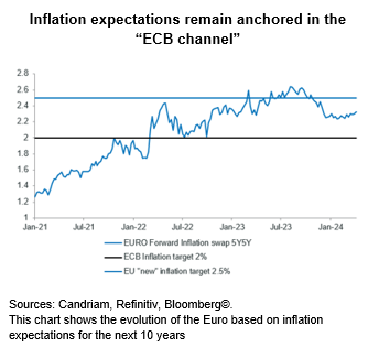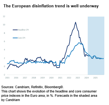 The ECB confirmed that the growth / inflation mix reveals nothing to derail the expected rate cut in June. We were therefore reassured by the central bank meetings and think that the upcoming rate cuts are an additional element which should cap long term bond yields.