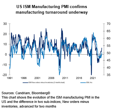 In addition to empirical evidence related to this indicator, technical analysis also points to a consolidation phase of mid-single digit amplitude. In our view, it is now time to start adding cyclicity to the portfolio to benefit from an improving fundamental environment: disinflation trends remain broadly intact – notably in the Euro area – allowing central banks to ease monetary policy restriction while economic data has been reported better than expected.