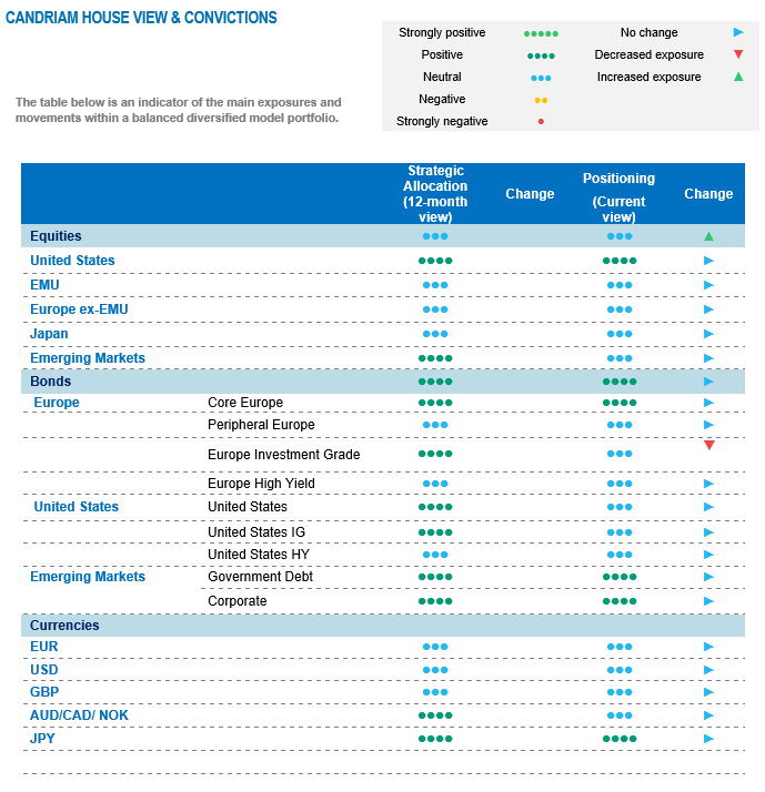 In terms of portfolio construction, we counterbalance the improvement from neutral to slightly overweight on the equity side, by reducing exposure on European Corporate Credit IG from overweight to neutral. This way we booked some handsome profits on this long-standing conviction in a context of tight credit spreads and somewhat increased volatility on yields.