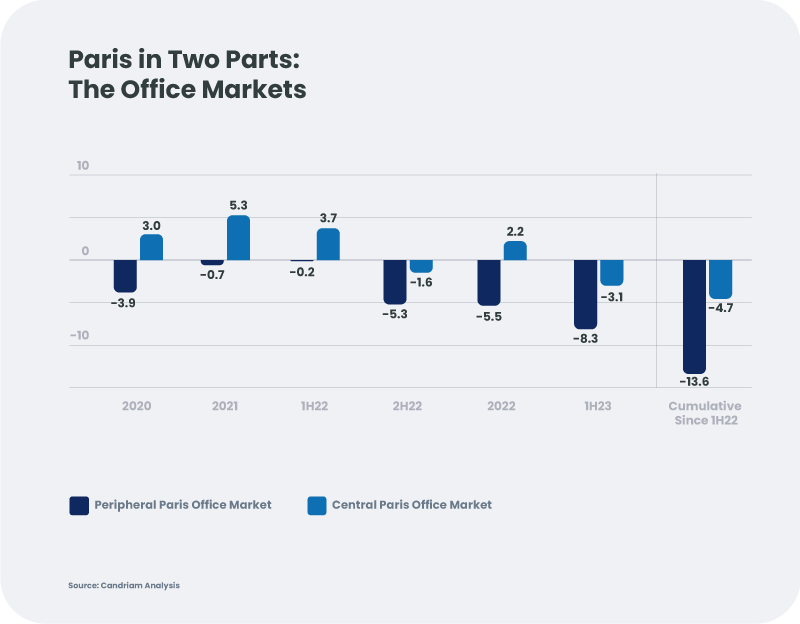 The recent Greater Paris office market has bifurcated, with Central Paris valuations declining in the mid-single-digit range, while peripherical regions have seen mid-double-digit declines since mid 2022, albeit from different base levels. Average net initial yields reached 6.5% in la Défense, while prime Central Paris business district assets reported rental yields of about 3%.