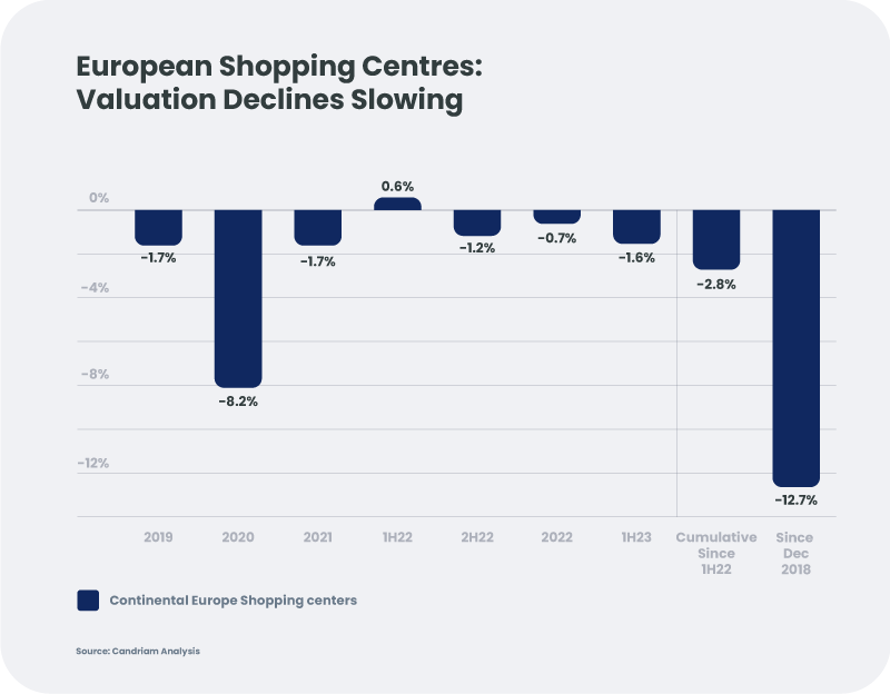 Retail landlords in Europe have faced greater property valuation losses than most other segments. Since the first half of 2022, valuations of prime shopping centres in continental Europe have declined only about -3%, while they have fallen about -15% since 2018 and now offer net initial yields of about 5.5% as of H1 2023.