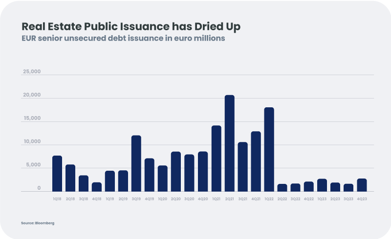 As to publicly traded debt for refinancings, the senior bond market had been virtually closed to most real estate issuers since the second quarter of 2022, as shown in the graph. We have recently seen some ‘green shoots’ – a few large issuers such as Covivio and Unibail-Rodamco-Westfield have returned to the primary market, with investors showing strong appetite for these new issues.