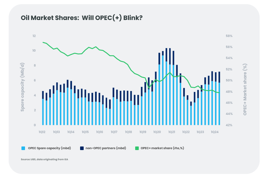 Balancing supply and demand will require careful coordination among OPEC+ members. Together, these 22 oil-producing nations in OPEC+ (the 12 OPEC nations and the additional 10 ‘non-OPEC partners’ who are included in OPEC+)1 are losing market share. Many want and/or need additional revenue, and we remain sceptical of their December 2024 production quota goals. We see room for OPEC+ to raise production in 2025. To add to dilemma faced by producing countries, global oil demand is expected to peak by the end of the decade and decline further by 2035.2 Plenty to this story to hold our interest!