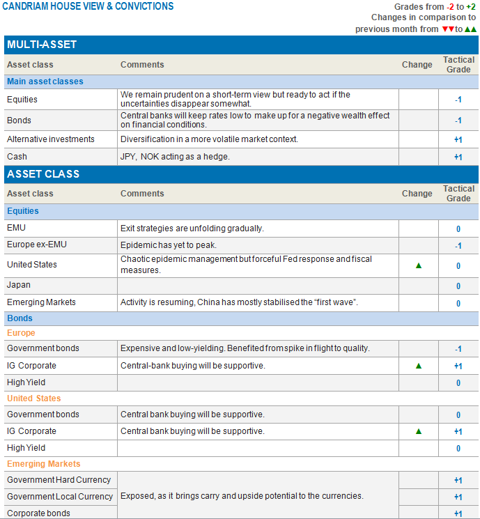 So far, this year, alongside the coronavirus outbreak, financial markets have dived. By the end of April, only gold and US government bonds had performed positively. By mid-May, global equity markets, although still in the red, had recovered roughly half their decline. The fiscal and monetary stimuli rapidly announced and put into place were strong supportive. Equity markets are now trading in a range, looking for direction. Will markets find some stability? The way forward will be determined, among other things, by the evolution of the epidemic. If it lingers, or worsens, confinement measures will be re-applied and, with that, economies come to a halt. If the epidemic finally slows down in a durable manner, countries will gradually be able to re-open while imposing a series of security measures: we are by now all too familiar with wearing a mask in public spaces and keeping our distance. As European countries are progressively exiting containment, a second wave of covid-19 is the main risk. This would hurt confidence, could trigger new containment measures and weigh on economic recovery. Market risk, valuation, epidemic-linked indicators, activity levels and policy response have all impacted our asset allocation. We currently remain underweight equities.