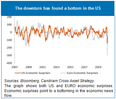 The graph shows both US and EURO economic surprises. Economic surprises point to a bottoming in the economic news flow.