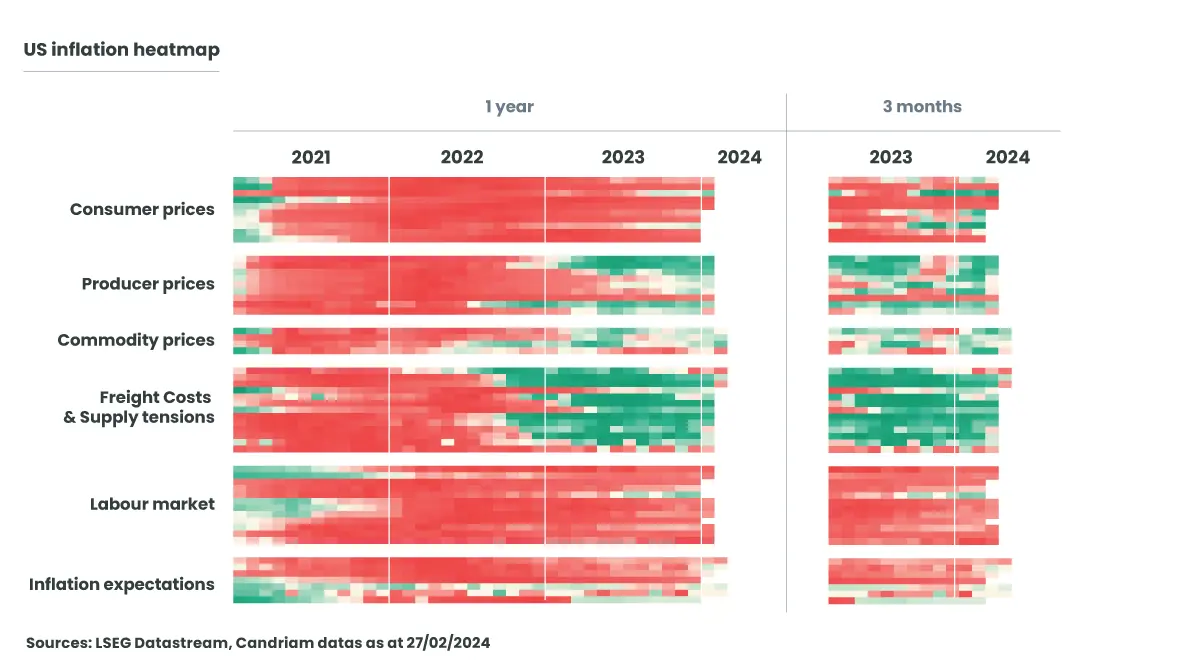 The "heatmap" above clearly illustrates, in the case of the United States, how far we've come in terms of disinflation. For several months now, the disinflation process seems to be well underway in most dimensions. However, persistent tensions on the labor market, both in the US and in the eurozone, should lead central banks to proceed with caution in easing their monetary policy. Following the last ECB communication, let's hope that the next Federal Reserve meetings on March 19-20 will continue to shed more light on the pace and scale of monetary policy easing to come... to be continued!
