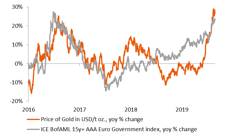 Second, as the investment world faces negative yields on over a quarter of outstanding investment-grade bonds and on additional monetary easing, there is no longer an opportunity cost in holding exposure to gold. A major setback of precious metals as an asset class is the absence of yield, such as dividends for equity holders and coupons for bondholders. The latter has become less relevant, as buying and holding to maturity nowadays could mean investing in assets guaranteed to lose. As the recent performance of gold has been linked to AAA-rated, long-duration bonds whose yield has fallen below zero, the relative attractiveness of this precious metal is shining through.