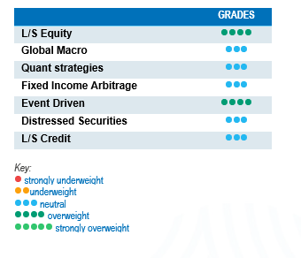 It was a strong month for Long-Short Equity strategies, which benefited from stock-market dispersion to drive returns from stock-picking on long and short positions. According to Morgan Stanley Prime Brokerage, the average Global Long-Short Equity captured 70% of the equities upside. Strategies with a focus in Europe and China returned a positive average return while their respective indices were negative for the month. US-focused strategies returned the highest average return in absolute terms but fared less well in relative terms, capturing only half the upside of US equities. Style-wise, market-neutral and growth-bias strategies outperformed managers with a value bias. Now that the rate-hiking cycle has probably reached the end of its course, we expect higher dispersion inter and intra sectors which will be beneficial for Long-Short Equities. Furthermore, these strategies have more tools than traditional long-only strategies to help navigate market volatility should the consensus scenario of moderate growth for 2024 hit a road bump.