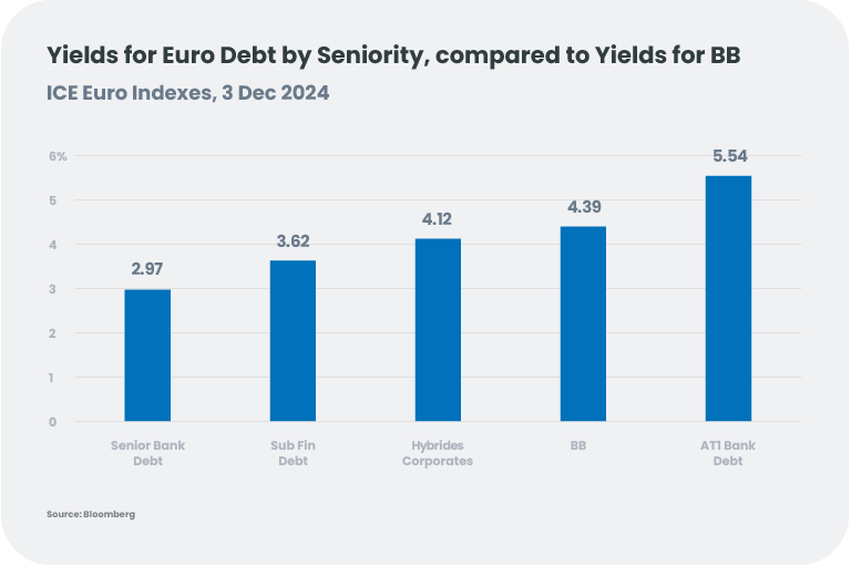 Compressed valuations of bank debt suggest that performance is more likely to come from carry than from spread tightening, all across the capital structure. But bank subordinated debt (Additional Tier 1 and, to a lower extent Tier 2) may selectively offer attractive yields, not only versus senior debt, but also in comparison with other riskier assets such as high-yield BB and hybrid corporates.