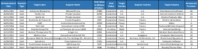 Let's start by defining what a "merger arbitrage" strategy is: it essentially consists of investing in companies already involved in M&A transactions, and aims to profit from the differential between the price offered for the buyout and that currently priced in by the market. The investment universe for merger arbitrage therefore comprises all M&A transactions involving listed companies. When a confirmed transaction is announced, the acquirer communicates to the markets its intention to acquire the target company at a price agreed between the parties. The target's share price naturally tends to approach this offer price, although it does not always reach it completely.