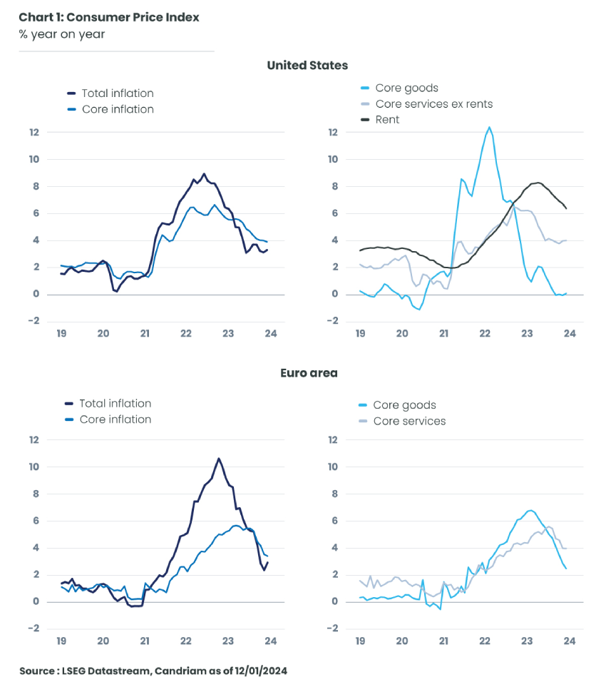 On both sides of the Atlantic, inflation was undoubtedly an important theme throughout 2023. At the end of last year, the multiplication of good news on this front fuelled the fall in long-term interest rates and expectations of lower short-term rates from the European Central Bank and the Federal Reserve. The latter even seemed to pivot at its monetary policy committee meeting in mid-December, arguing in particular that it would be careful not to make the mistake of maintaining an overly restrictive monetary policy... for too long! Is the battle against inflation, begun by central banks in 2022, coming to an end?