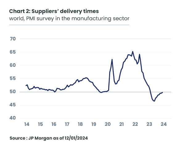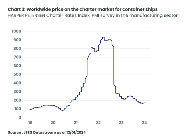 Supply chains and world trade were profoundly disrupted during the pandemic: the resulting rise in the price of goods was spectacular in the United States and, to a lesser extent, in the Euro zone. Four years after the outbreak of the pandemic, these tensions have dissipated: companies in the manufacturing sector report that delivery times have returned to normal (Chart 2), and sea freight costs have almost returned to 2019 levels (Chart 3).