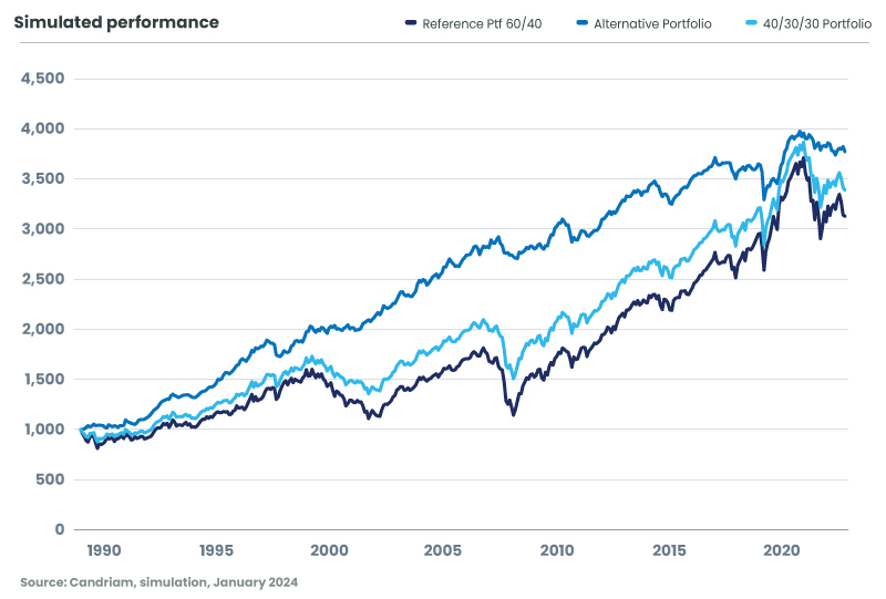 In our paper, we show that introducing the right alternative strategies may enhance the return/risk profile of a balanced portfolio. The 40/30/30 portfolio, with variable allocation adjusted to the economic phases, offers higher performance than the 60/40 portfolio.