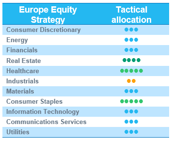 We also maintain our positive (+2) rating on the Healthcare sector. European Healthcare offers an attractive risk-return profile thanks to reasonable valuations, strong cash flow visibility and projected earnings growth.