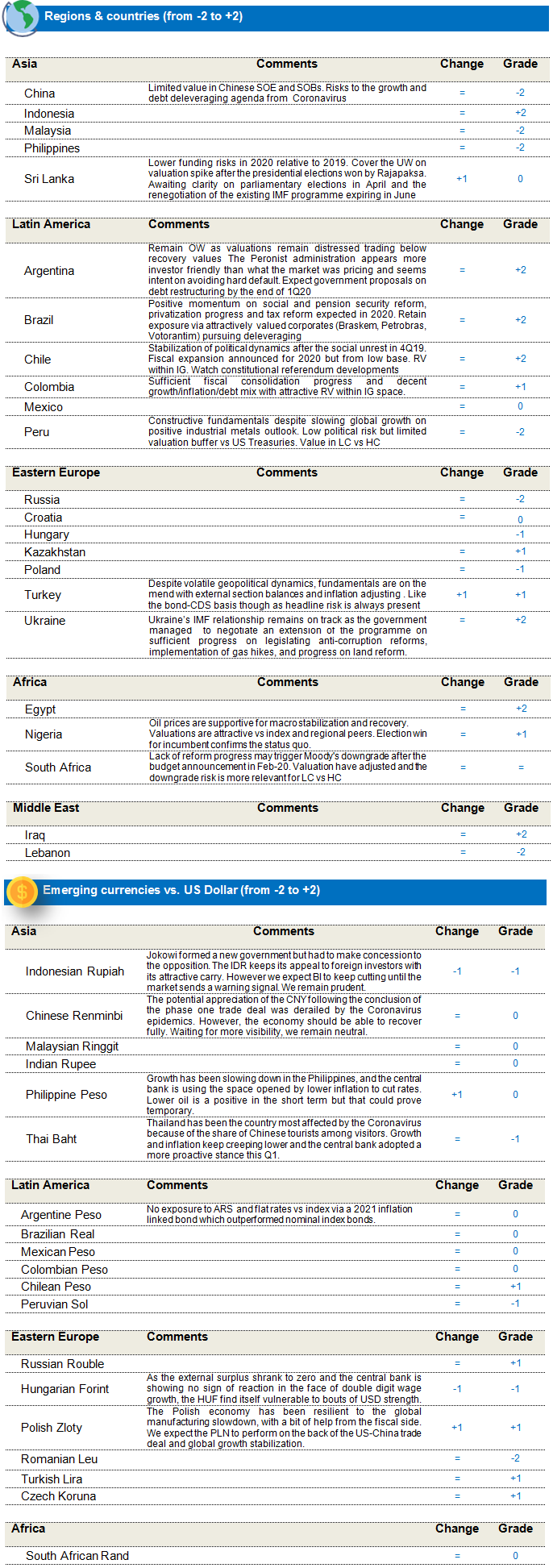 We have retained underweights in Lebanon, Russia and Saudi Arabia as we do not assess we would get compensated for sanctions or political risks in these credits. In Brazil, Mexico and Turkey we hold overweights in attractively priced quasi-sovereigns and corporate bonds versus underweights in sovereign bonds. We also retain a tactical 6% CDX.EM asset class protection position in general asset class uncertainty related to the coronavirus global growth impact.