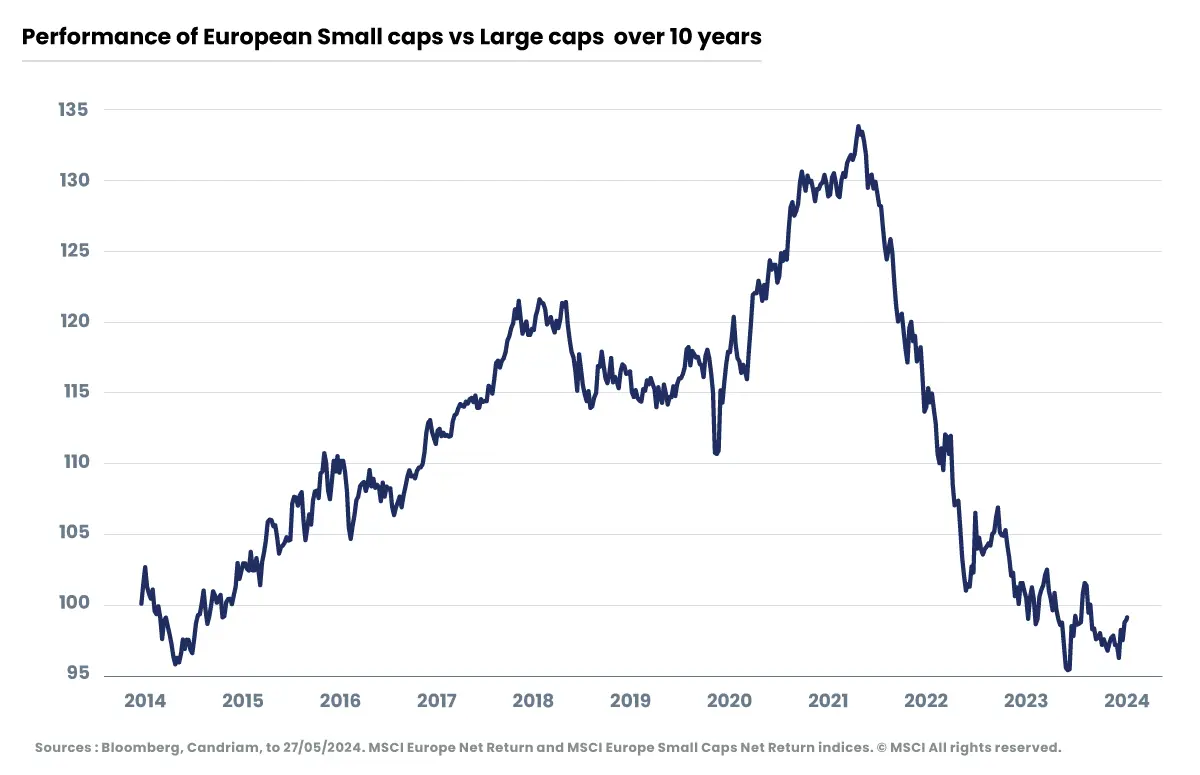 [1] Price/Earnings ratios, MSCI Europe Small Caps and MSCI Europe indices, © MSCI All rights reserved Source: Bloomberg, as at 28/05/2024