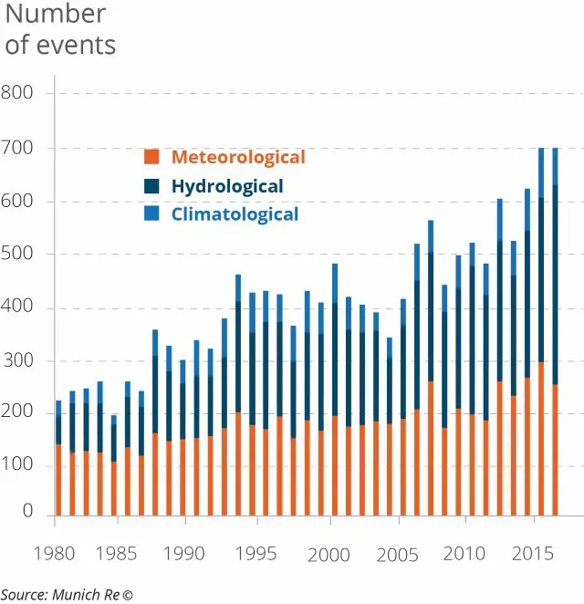 Climate adaptation presents the second huge opportunity category for investors. Climate change is already here. The number of weather-related natural disasters doubled between 1990 and 2018, according to insurance company Munich Re. Assuming an orderly energy transition, we still have to adapt.