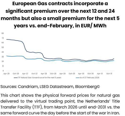 Specifically, European economies remain highly vulnerable to gas price dynamics, as illustrated by the persistent premium embedded in forward contracts. The Title Transfer Facility (TTF) contract curve, the European reference for the price of natural gas, shows additional premiums of EUR 20 and EUR 15 over the next 12 and 24 months compared to end-February levels, signalling that markets expect elevated energy costs to persist.