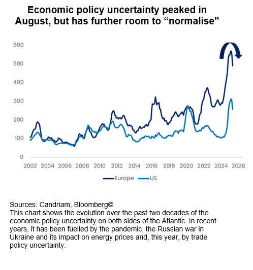 Uncertainty peaked in August and has since subsided. Policy risk has eased, financial conditions have improved, and even geopolitical headlines now carry less shock value. A year after a presidential election that promised turbulence, the macro backdrop looks steadier, not shaken. For markets, this matters: the balance between caution and opportunity is shifting towards risk-taking.