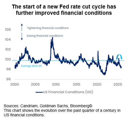 So far, however, renewed monetary easing has restored flexibility to the system. US financial conditions are now looser than their long-term average, reflecting the October rate cuts and stable credit markets. Liquidity is ample, volatility subdued, and the bond market’s message is consistent: the economy is cooling gently, not contracting.