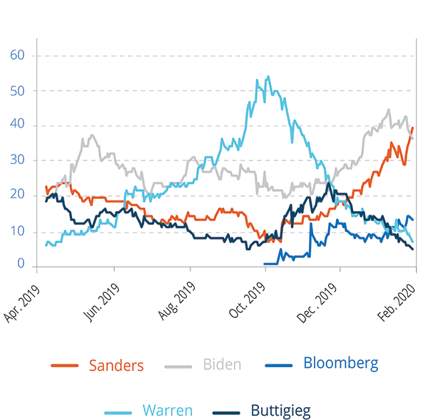 A divisive and contested election. The 2020 election is expected to be one of the most divisive elections in US history. If we look at four macro elements (Corporate and Personal taxes, Regulation, and Trade) and four important sectors (Energy, Healthcare, Finance, and Tech), it is apparent that nearly all positions of incumbent President Trump are diametrically opposed to those put forward by progressive Democrats such as Bernie Sanders and Elizabeth Warren. The field of Democratic candidates still includes moderates such as Joe Biden, Pete Buttigieg and Michael Bloomberg.