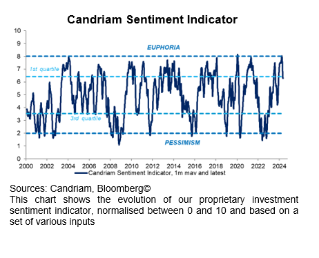 As expected, the month of April witnessed a consolidation following the strong performances registered in the previous two quarters. As a result, our composite sentiment indicator, based on a comprehensive set of market factors, technical data and investor surveys, has retreated after sending warning signs by hitting the “euphoria” level mid-March.