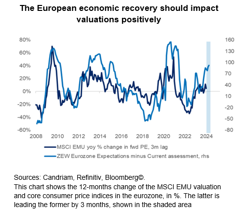 We continue to add some beta and cyclicity to the portfolio to benefit from a broadening of the favourable environment: lower inflation than expected and higher growth than expected. In Europe in particular, economic surprises are now positive, leading to improving sentiment and flows. Therefore, we are upgrading eurozone equities further, from neutral to slightly positive, adding small caps and banks to the portfolio.