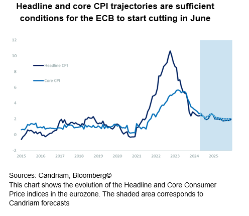 The upcoming central bank rate cuts are an element which should cap long-term bond yields, motivating our long duration stance. Of note, it is also the first time in the 25-year history of the ECB that the reference rate will be cut due to improving disinflation and not faltering activity.