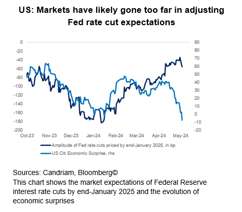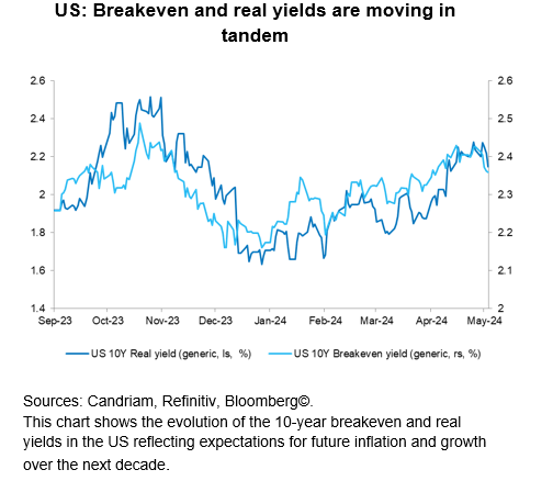 There is good news to these downside surprises: market expectations regarding Fed rate cuts have likely run their course. The more hawkish market expectations for the Fed since the start of this year have come to an end, which corresponds to the peak in US 10-year Treasury bond yields at 4.70% at the end of April. Interestingly, the recent drivers of long-term yields have been both breakeven and yields, reflecting expectations for future inflation and growth.