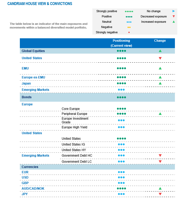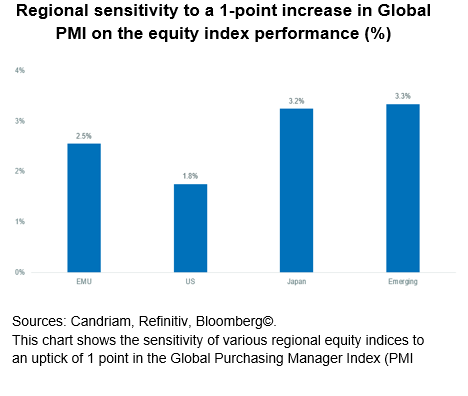 Regarding equities, we further increase our view from slight overweight to an overweight stance. We are keeping a cyclical bias in our allocation, and are therefore adding to Japanese and European equities, while somewhat reducing exposure to the US: among the major investment regions, the latter has the lowest sensitivity to an increase in global activity indicators, such as the Global Purchasing Manager Index.