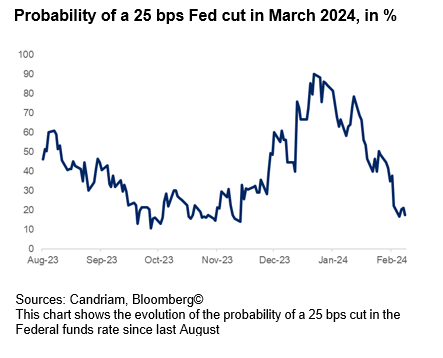 There will be no major central bank meeting in February, therefore giving enough time for markets to adjust further the timing and the amplitude of future rate cuts. The probability of a first Fed rate cut as soon as March has declined from 90% to less than 20% in just six weeks. Our expectation that the easing cycle will occur this summer is becoming more consensual.