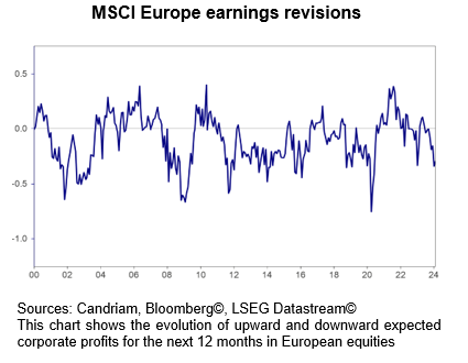 In Europe, patience may reward investors attentive to sectors that stand to gain from eventual economic stabilisation and ECB policy shifts. Pieces could start falling into place and a more vigorous signal of a more supportive policy mix could become a welcome signal for the region’s assets. now, analyst revisions of future corporate profits are very weak, acting as a headwind for European equities.