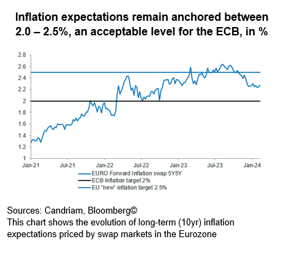 • We are also buying core European government bonds with the objective of benefiting from the carry in a context of cooling inflation, sluggish activity and upcoming central bank rate cuts. As inflation expectations remain well anchored, the ECB has started to shift to less hawkish rhetoric.