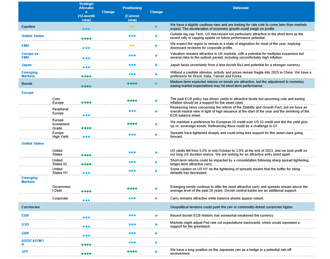 Our strategy takes into account that sentiment has turned bullish, imbalances have risen and financial markets are questioning Fed interest rate cuts as early as March. Therefore, a balanced strategy – attentive to the evolving narratives and electoral campaigns in the US, Euro area and beyond – will be crucial in navigating the opportunities and challenges that lie ahead.