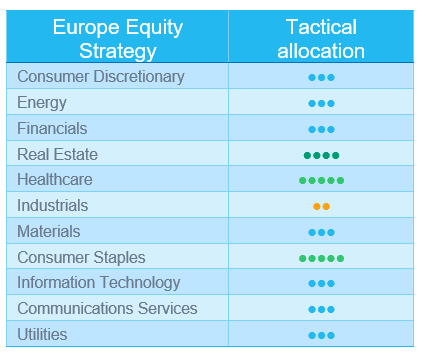 We confirm our positive stance (+2) on Consumer staples, one of our strongest convictions in this uncertain market. Within consumer staples, we favour food & beverage and household & personal products companies. We remain cautious on food & staples retailing but last month we upgraded our rating on this sub-segment  from -2 to -1 on the back of resilient EPS momentum.