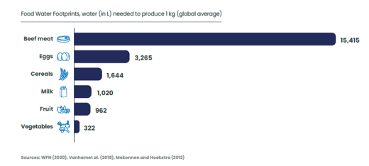 La agricultura representa más del 70% de las extracciones mundiales de agua dulce[3]. Ya conocíamos la escandalosa huella de carbono de un trozo de carne, ¿sabías que su huella hídrica es diez veces superior a la de los cereales?