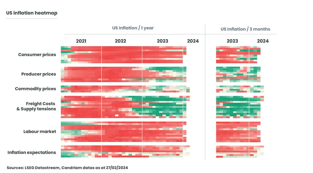 El "mapa de calor" anterior ilustra claramente, en el caso de Estados Unidos, lo lejos que hemos llegado en términos de desinflación. Desde hace varios meses, el proceso de desinflación parece bien encaminado en la mayoría de las dimensiones. Sin embargo, las persistentes tensiones en el mercado laboral, tanto en Estados Unidos como en la zona euro, deberían llevar a los bancos centrales a proceder con cautela a la hora de relajar su política monetaria. Siguiendo la última comunicación del BCE, esperemos que las próximas reuniones de la Reserva Federal el 19 y 20 de marzo continúen arrojando más luz sobre el ritmo y la escala de la flexibilización de la política monetaria que está por venir... ¡Continuará!