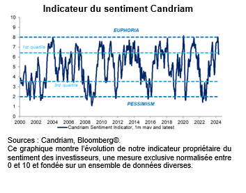 Sans surprise, le mois d'avril a été marqué par une consolidation après les solides performances enregistrées au cours des deux trimestres précédents. En conséquence, notre indicateur composite du sentiment, fondé sur une batterie complète de facteurs de marché, de données techniques et d'enquêtes auprès des investisseurs, a reculé après avoir déclenché un signal d’alerte en atteignant le niveau d'« euphorie » à la mi-mars.