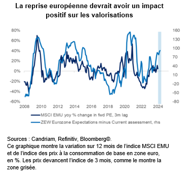 Nous sommes plus optimistes sur les actions européennes après le rebond du PIB : la croissance a atteint 0,3 % au cours du premier trimestre dans la zone euro, alors qu'une quasi-stagnation était attendue. Cette reprise de l'activité, jusque-là au point mort, devrait soutenir les valorisations des actions de la région et permettre une généralisation des bonnes performances. Les indicateurs prospectifs vont incontestablement dans ce sens.