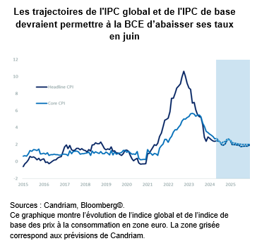 De fait, l'Europe devrait enregistrer une décélération de l'inflation plus rapide et plus durable que les États-Unis. Sauf choc imprévu, selon nos prévisions, l'inflation globale en zone euro pourrait atteindre 2,0 % vers la fin du troisième trimestre, avant de se redresser légèrement, puis passer la majeure partie de l'année 2025 juste en dessous de l'objectif d'inflation de 2,0 % fixé par la BCE. Parallèlement, l'inflation sous-jacente dans la région devrait converger progressivement vers 2,0 % d'ici le premier semestre 2025. En résumé, un IPC global et un IPC de base à 2,5 % en glissement annuel aujourd'hui, et qui passeraient sous la barre des 2 % en 2025, devraient permettre à la BCE d’abaisser ses taux dès le mois de juin.