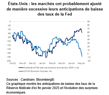 Autrement dit, si la croissance reste globalement solide aux États-Unis, il serait ambitieux d’anticiper une accélération à partir de maintenant. À cet égard, plusieurs indicateurs ont déçu au cours des dernières semaines (surprises économiques négatives).