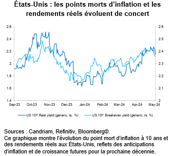 Les surprises à la baisse sont probablement une bonne nouvelle pour les anticipations de baisses des taux de la Fed par le marché. Alors que les craintes manifestées par les investisseurs depuis le début de l’année vis-à-vis d’un possible durcissement de la Fed refluent, le rendement des bons du Trésor américain à 10 ans a atteint un pic de 4,70 % à la fin avril. Il est intéressant de noter que les récents moteurs des taux à long terme ont été les points morts d’inflation et les rendements, reflets des anticipations d'inflation et de croissance futures.