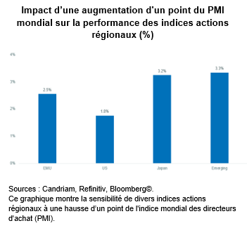 En ce qui concerne les actions, nous accroissons nos positions et passons de « surpondération légère » à « surpondération ». L’allocation conserve un biais cyclique et nous renforçons les actions japonaises et européennes, tout en réduisant l'exposition au marché américain : parmi les principales régions d'investissement, les États-Unis sont les moins sensibles à une hausse des indicateurs d'activité tels que l'indice mondial des directeurs d'achat.