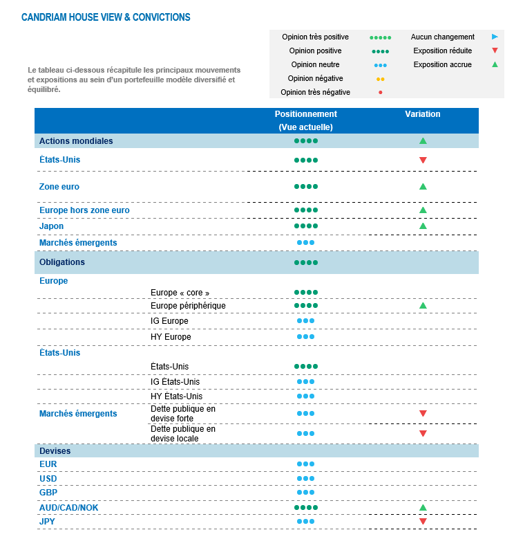 Actions : nous accroissons nos positions et passons de « surpondération légère » à « surpondération ». Les récents indicateurs d'activité et les baisses de taux à venir pourraient soutenir davantage les marchés.